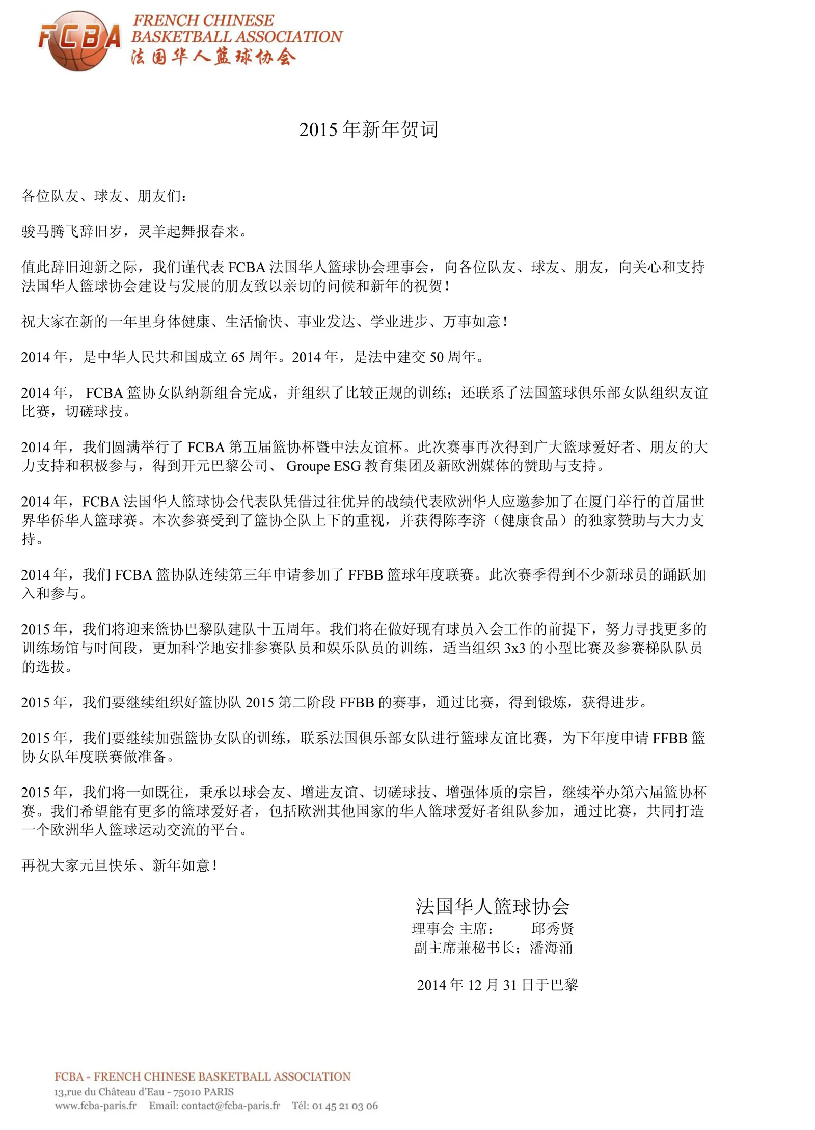 法国华人篮协恭祝大家2015年新年快乐
