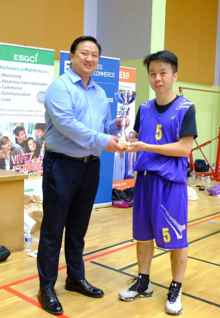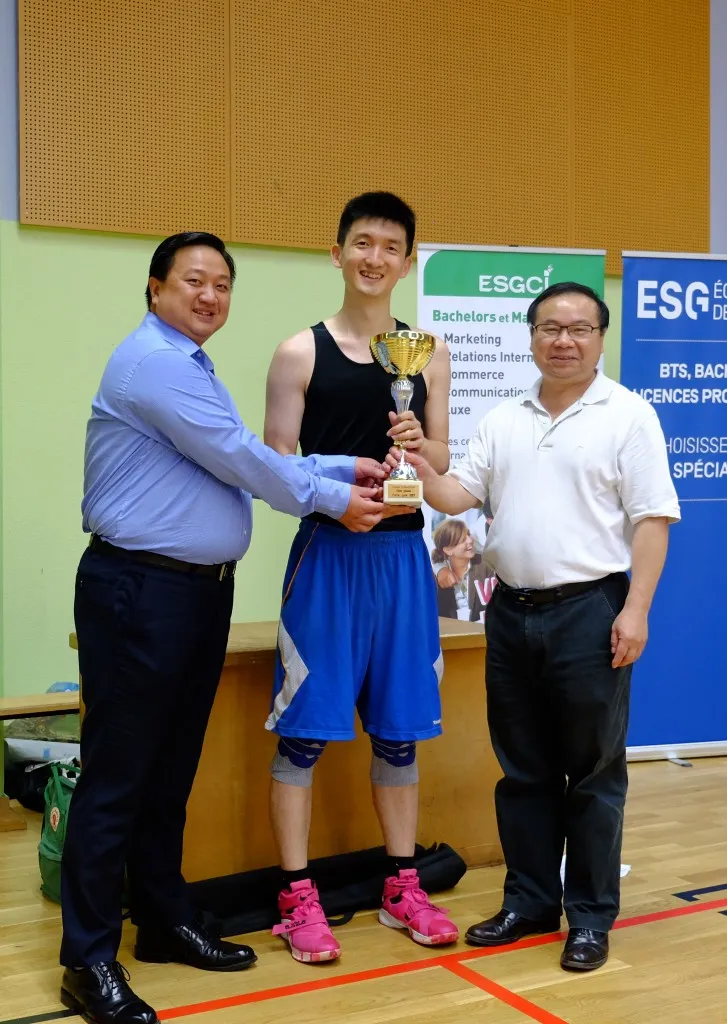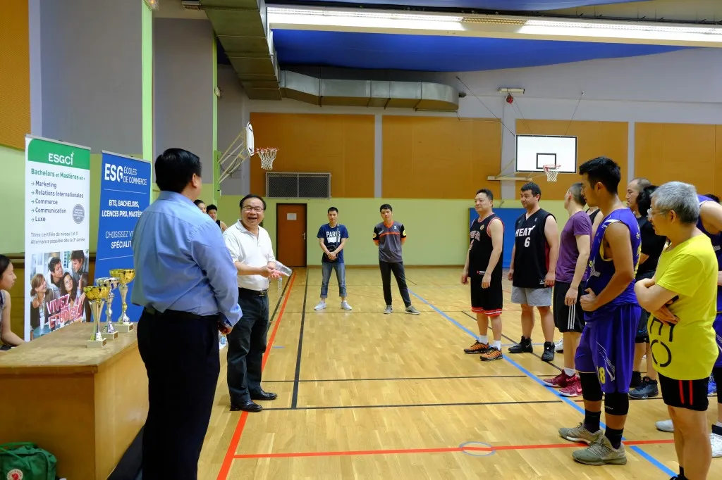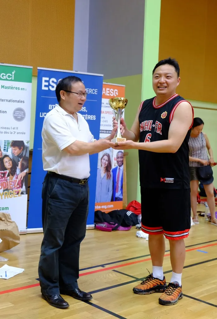 北外法国校友会会长兼外语院校法国校友会联盟主席刘亚中老师到场观球,为中国高校运动员们助威加油;中国驻法使馆科技处董琳秘书莅临比赛现场并与FCBA法国华人篮协主席邱秀贤一起为优胜队颁发奖杯。
